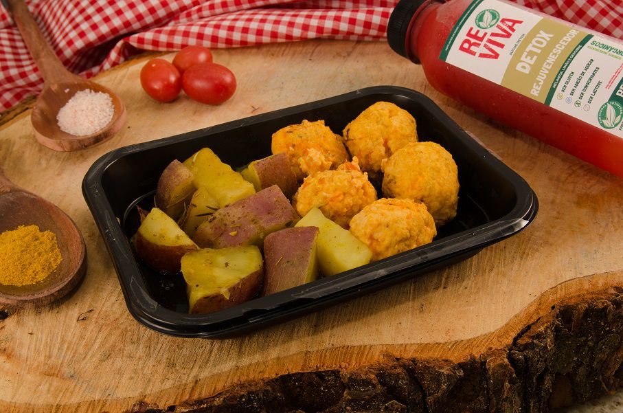 Ingredientes: Filé de frango, batata doce, farinha de arroz, cebola, cenoura, molho de tomate natural, alho e sal rosa