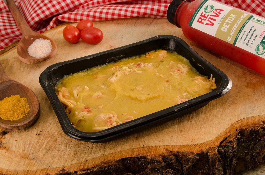 Ingredientes: filé de frango, batata doce, tomate, cheiro verde, alho, sal rosa e oleo de soja